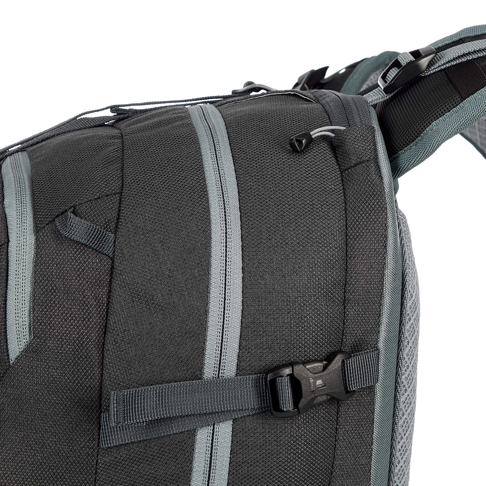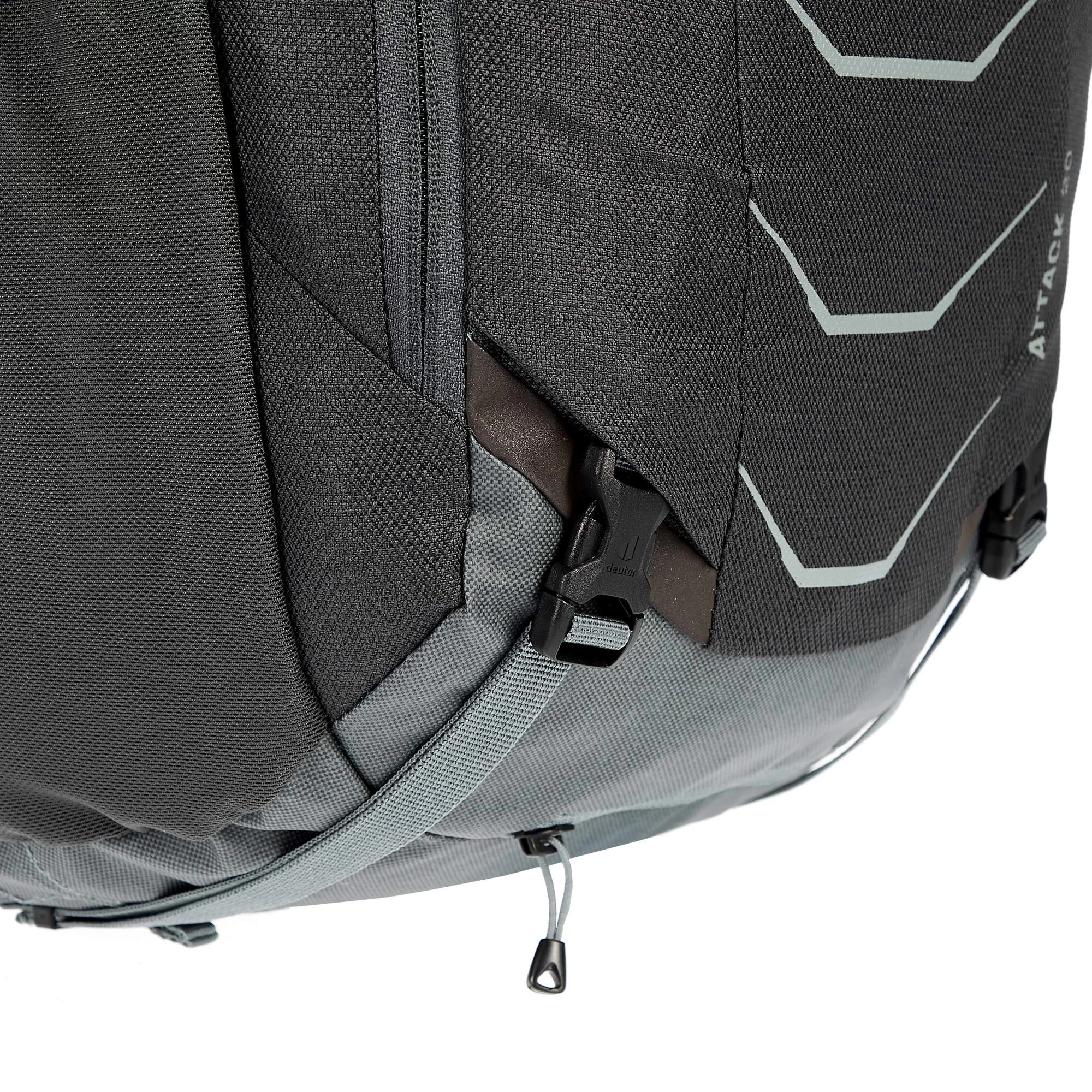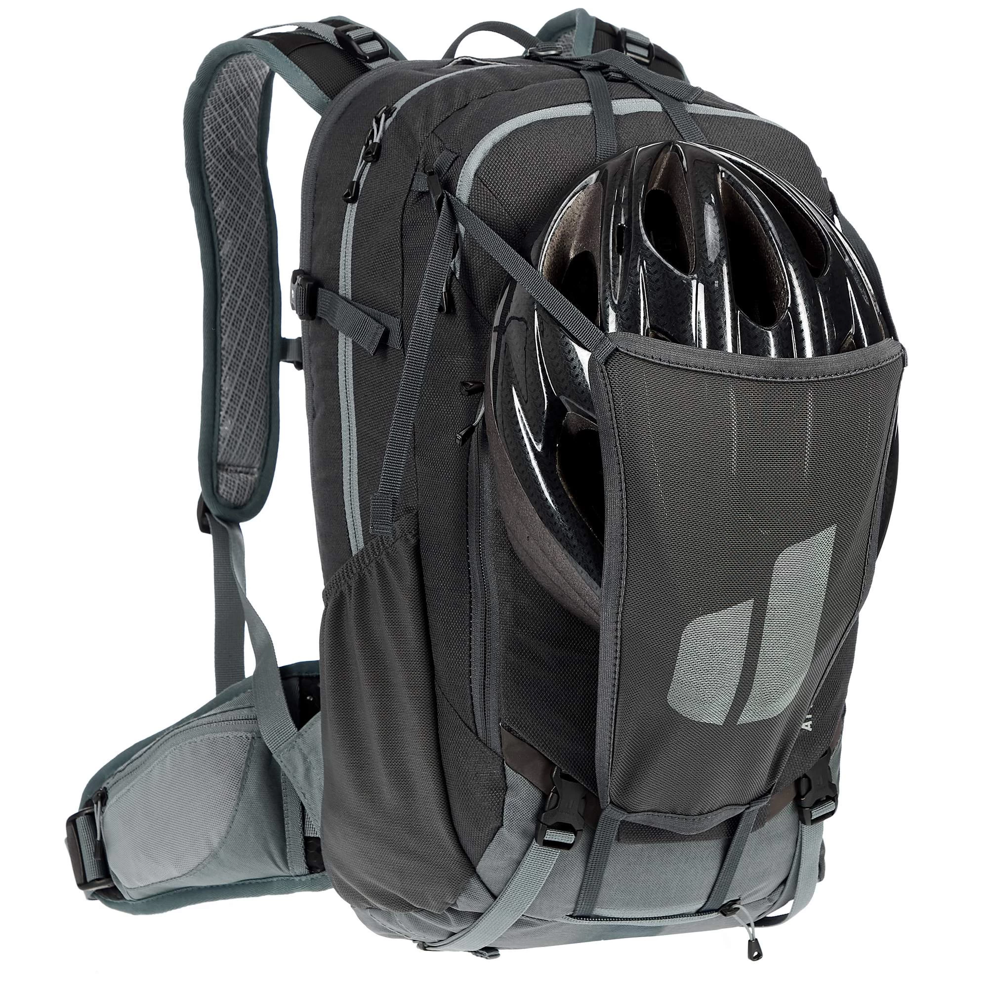 Der Bike-Rucksack bleibt dank des hohen Hüftflossen-Ansatzes auch auf ruppigen Abfahrten fest auf deinem Rücken. Du musst eine Tragepassage absolvieren? Kein Problem: Der Carrying Guard des Attack 20 erleichtert dir das Tragen deines Bikes auf deinem Rucksack. Die versteifte Zone oben am Rucksack sorgt dafür, dass dein Bike an Ort und Stelle bleibt, wenn du es samt Rucksack über nicht fahrbare Trail-Abschnitte trägst. Bei schweißtreibenden Auffahrten kannst du deinen Helm und deine Protektoren ganz einfach außen am Rucksack befestigen. Auch Fullface-Helme sind gut gesichert; für den Kinnbügel hat der Attack 20 extra einen passenden Riemen.